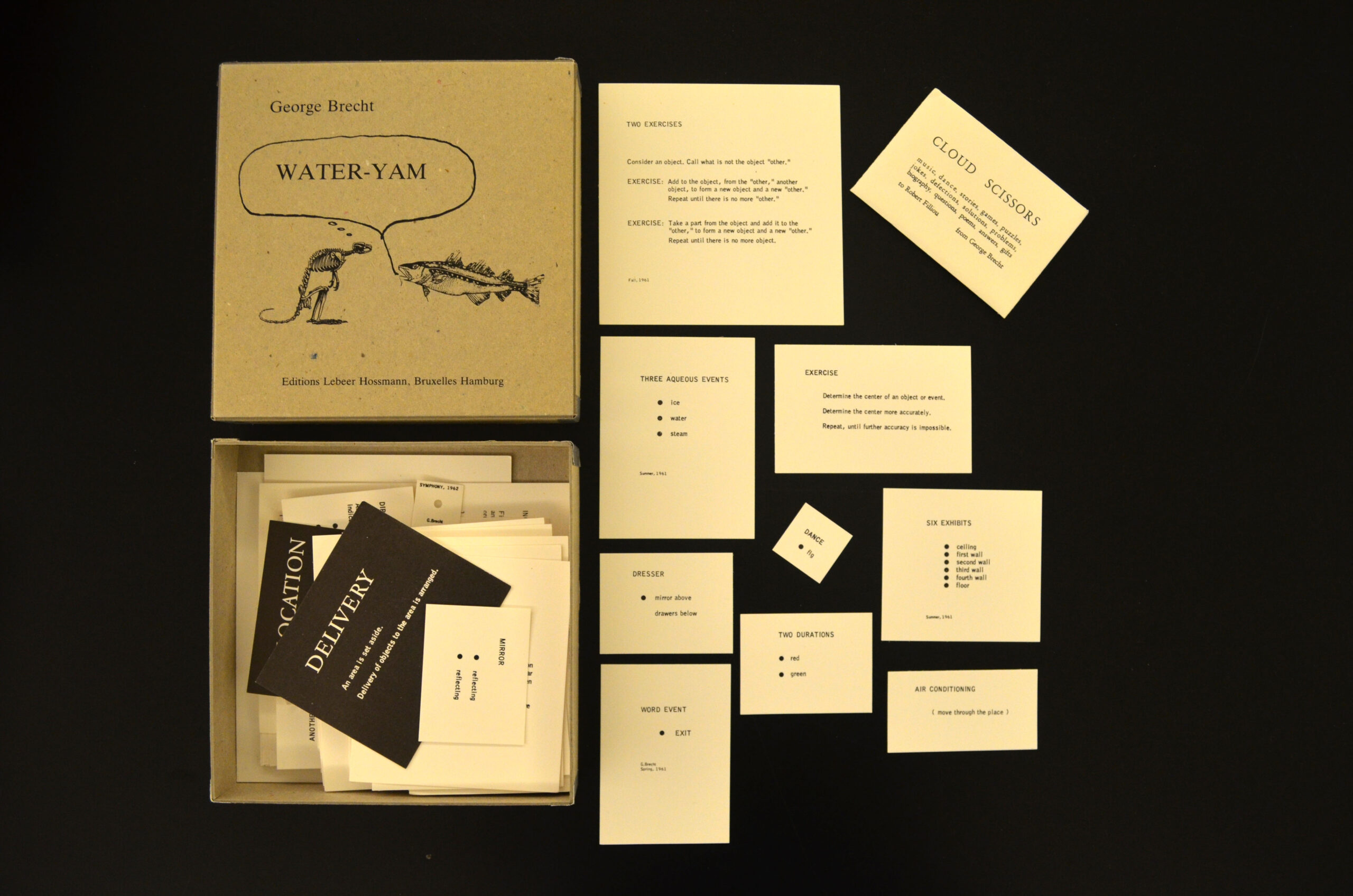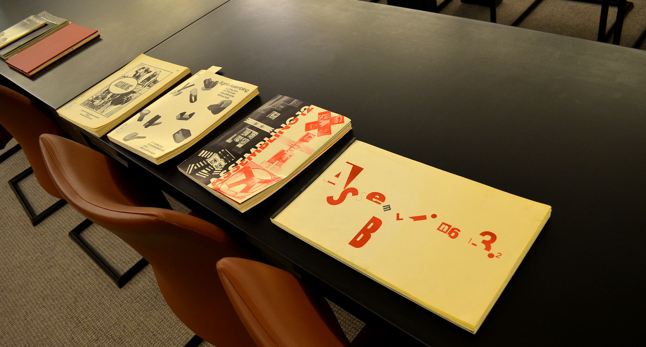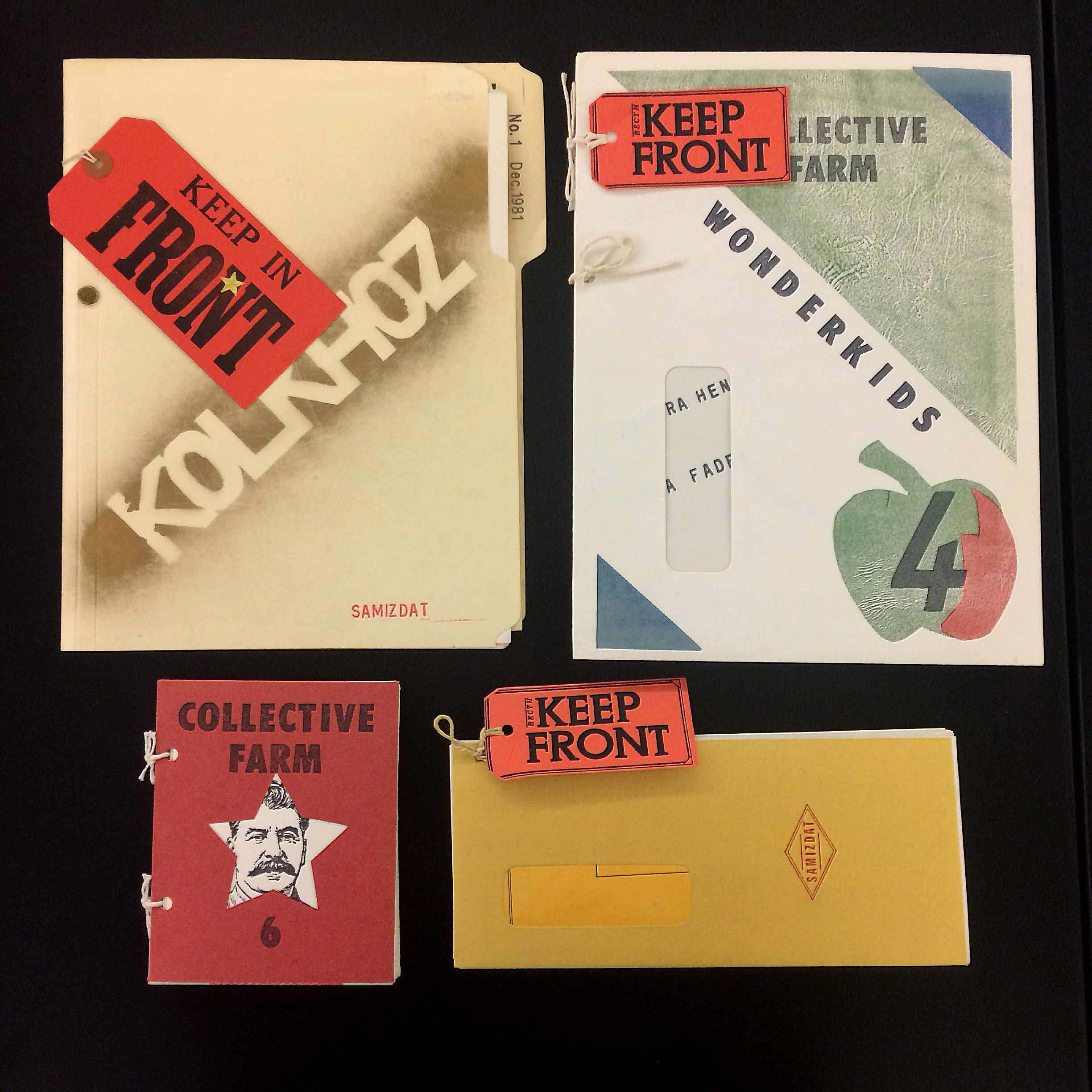 Works ranged from: a facsimile of Dada Zeitschriften; multiple works from Imma Gerlovina and Valeriy Gerlovin’s Collective Farm project; George Brecht’s Water-Yam; a facsimile, translation, and original copy of Vladimir Mayakovsky and El Lissitzky’s For the Voice; Fortunato Depero’s Depero Futurista;—to—Barbara Kruger’s No Pleasure in Progress; Dieter Roth’s Picadilly Postcards; Margaret Kaufman and Claire Van Vliet’s Aunt Sallie’s Lament—to—Bern Porter’s The Manhattan Telephone Book, and multiple works from Wedge Press and Assembling.