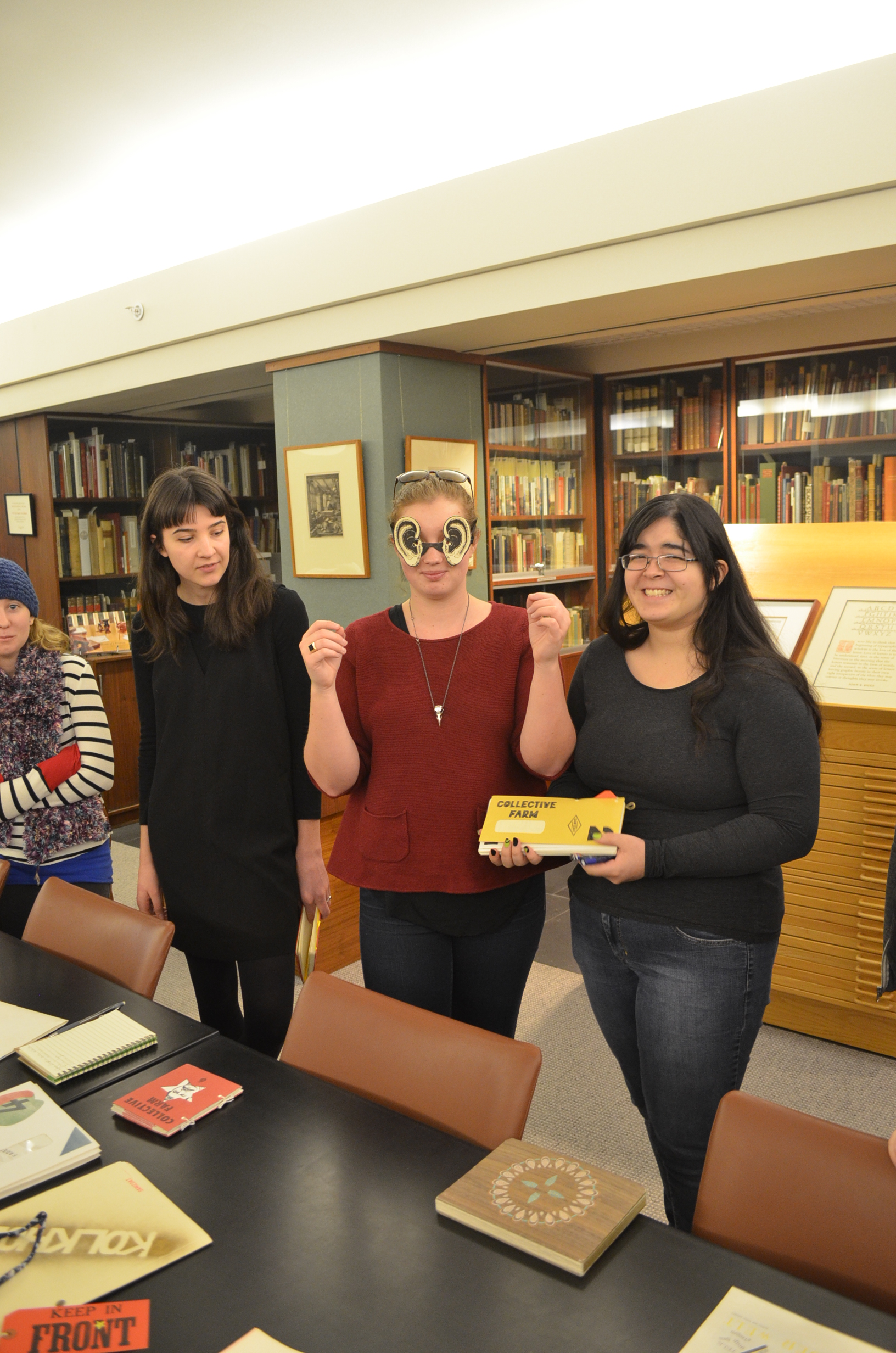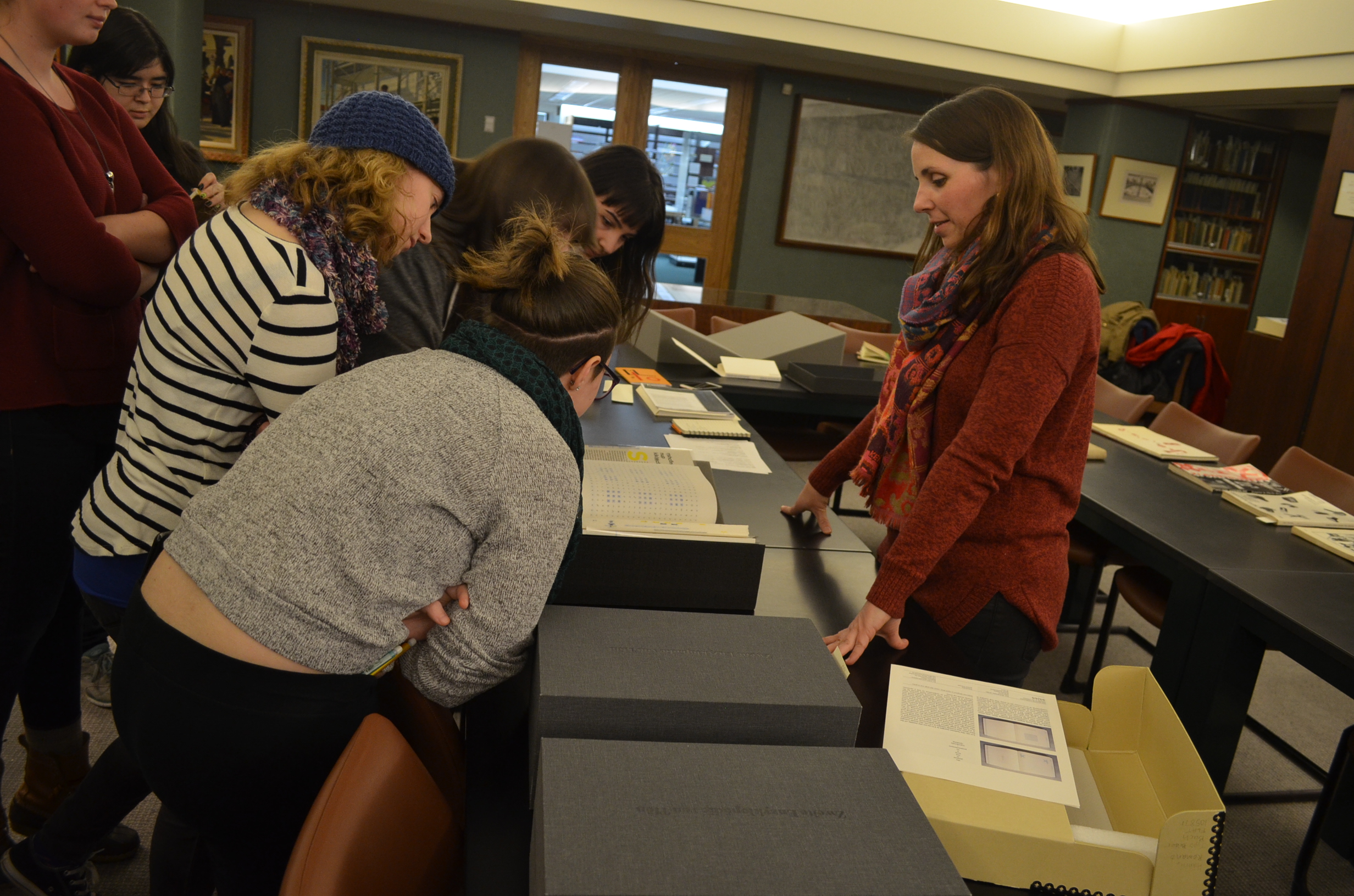 On a wet, wintry February day, students from our advanced level book arts course, The Printed Book, made the trek out to visit the Cary Graphic Arts Collection in the Wallace Center at the Rochester Institute of Technology (RIT). As “a library and archive of books, type specimens, manuscripts, documents, and artifacts related to the history of graphical communication (wiki)” this trip was of particular significance for students in this course, which explores the printed book, with an emphasis on the critical action of publication—from fine press to artists’ book to democratic multiple—within the scope of contemporary and historic publishing practices. Basically, anything you could think of wanting to pull for context in the realm of artistic [publishing] and [book] production was at the ready and in mass.